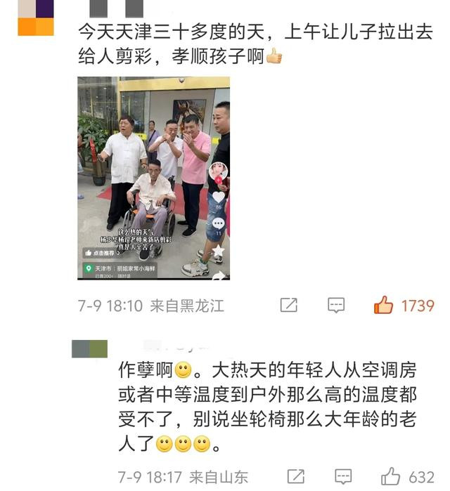 要说一把年纪了,只是一个剪彩仪式,就不应该让老爷子出面。拍视频的人还特意标明“热天气,杨少华老师来新店剪彩,太辛苦”,这不是纯折腾人呢?