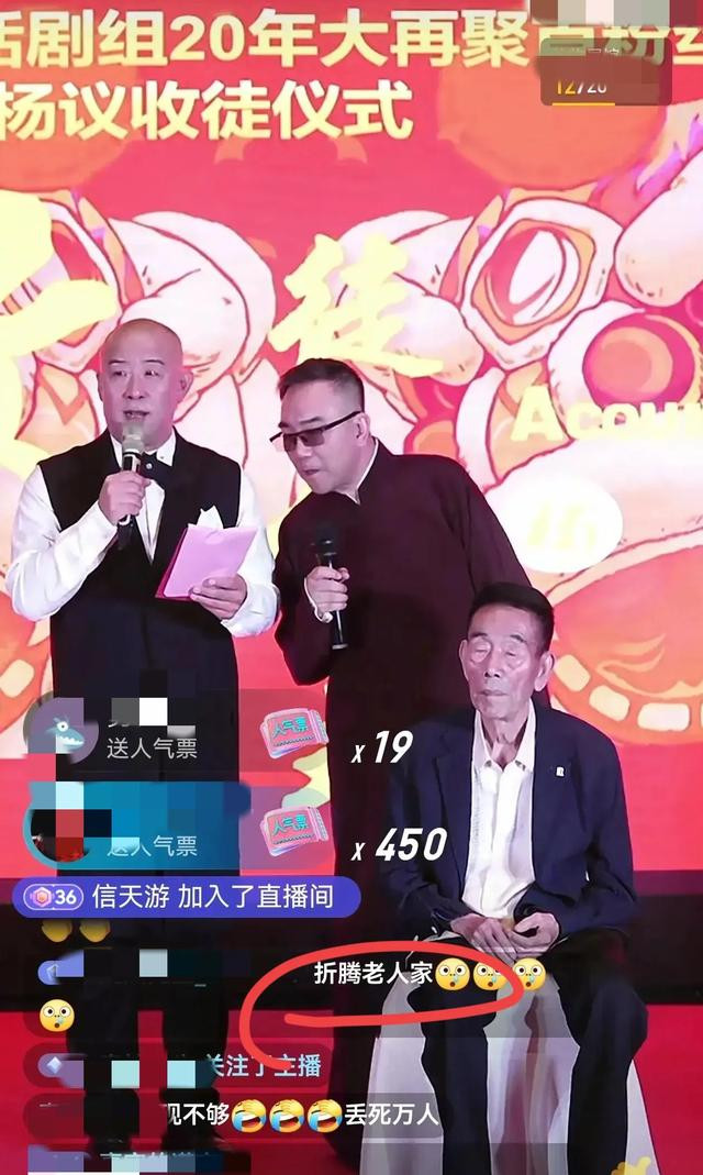说好听点是让老爷子撑场面,说难听点杨议这种行为就是在啃老。剧组20年大聚会,杨议开直播收徒。就连这种时刻,也得让高龄老人在旁边坐着。自己带个墨镜,跟旁边的串场人一唱一和,老爷子孤零零坐在轮椅上,瞌睡的眼睛都快睁不开了。网友直言:折腾老人家?